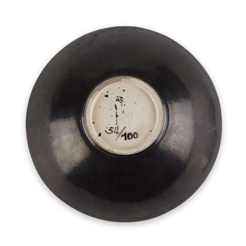 1960, numbered 54/100, with the 'MADOURA EMPREINTE ORIGINAL DE PICASSO' stamp on the underside. White earthenware clay bowl with engraving and oxidized paraffin under glaze.