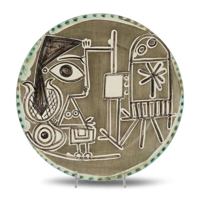 1956, numbered 103/200, with the 'EMPREINTE ORIGINALE DE PICASSO' and 'MADOURA PLEIN FEU' stamps on the underside. White earthenware clay round dish with decoration in engobes under partial brushed glaze.