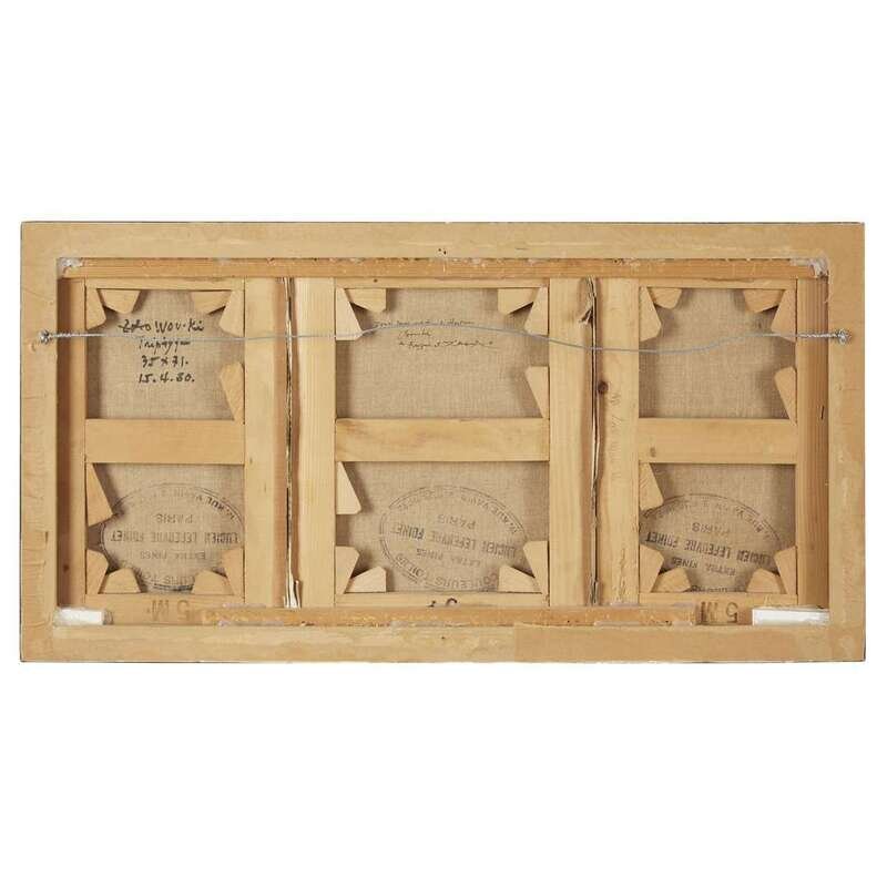 Signed and signed in Chinese bottom right, signed again, titled, dated '15.4.80,' inscribed with dimensions and dedicated 'Pour Donna et Arthur A. Hartman / Amitiés, de Françoise et Zao Wou-Ki' verso, oil on three joined canvases.