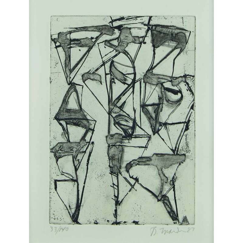 1987, the etching pencil signed and dated, numbered 33/140 (there were also two printer's proofs), with wide margins, loose (framed separately from the accompanying book, "Thirty-Six Poems by Tu Fu translated by Kenneth Rexroth with reproductions of 25 etchings by Brice Marden"), Peter Blum Editions, New York, publisher. Etching and aquatint on BFK Rives and cloth-covered book within original blue cardboard slipcase.