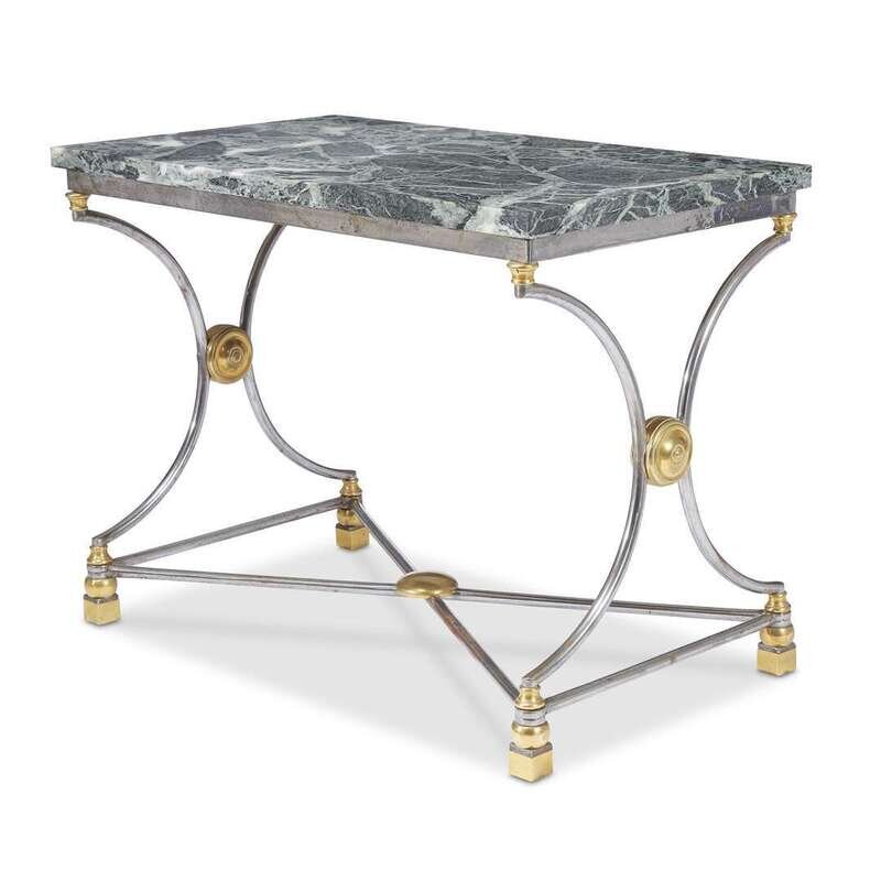 With later Serpentine marble top, the rectangular steel frieze raised on two X-form legs united by X-form stretcher raised on block feet.