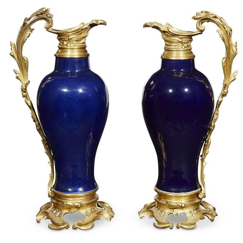 A pair of Louis XV style ormolu-mounted cobalt-glazed porcelain ewers 19th century