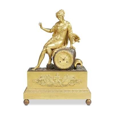 In the style of Albert-Ernest Carrier-Belleuse (French, 1824-1887), depicting a classical maiden seated atop a rock at water's edge with overturned water basin, the wreathed gilt-bronze engine-turned dial with black enamel Roman numerals; the eight-day movement with original silk suspension, now torn, the backplate impressed "98/St."