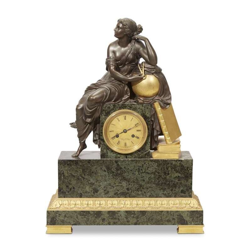Depicting a recumbent muse of science atop a Granito delle Alpi serpentine marble case housing engine-turned gilt-bronze dial with black enamel Roman numerals, the face signed "Vittoz Ft. a Paris" above rectangular base with ormolu foliate-cast band on block feet; the eight-day movement with original silk suspension.