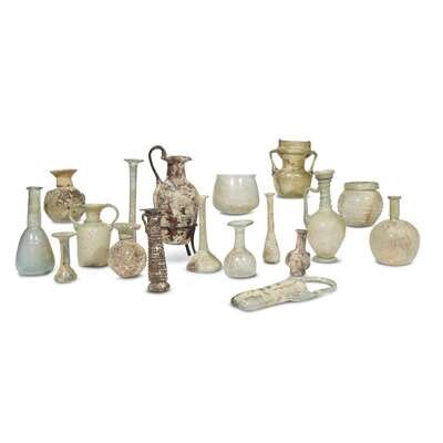 Comprising four globular unguentaria, three candlestick unguentaria, two conical unguentaria, one amphora-form unguentarium, one amber two-handled alabastron with applied spiral decoration, one amber figural alabastron, one double balsamarium, two round open vessels, one amber glass oenochoe on modern stand, one lekythos with applied spiral decoration, and one small amphora; all with varying amounts of lustre. (18).