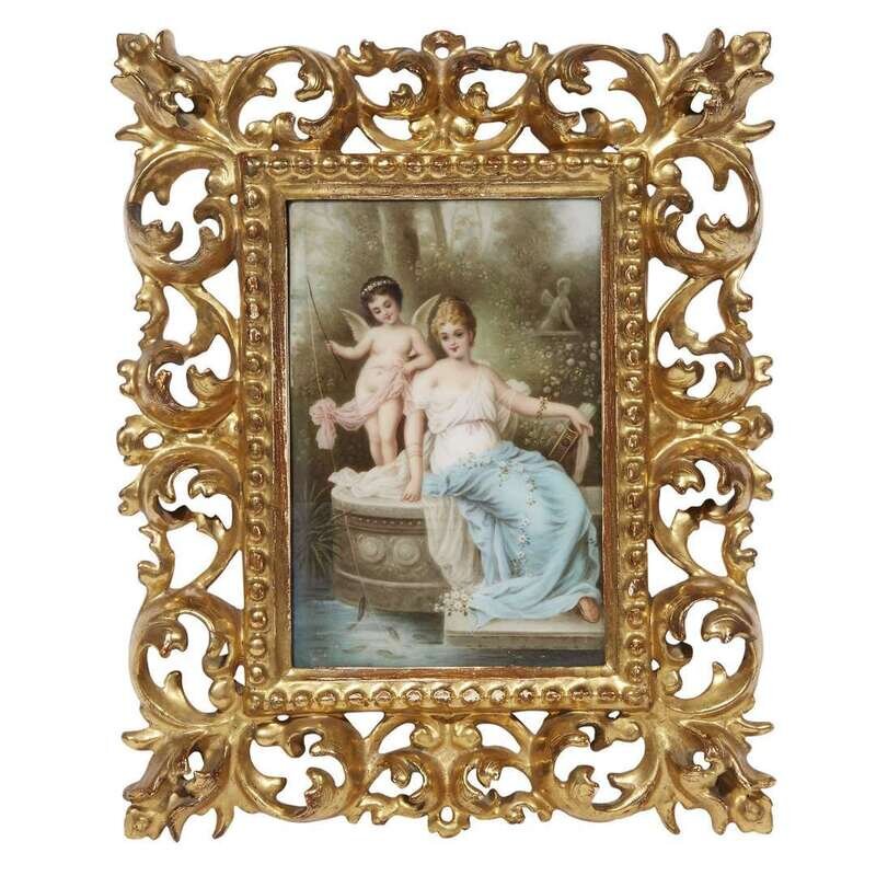 Depicting a beauty fishing with a putto, titled in pencil to verso and impressed "310;" housed in fine florentine frame.