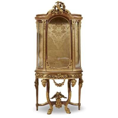 In two parts, the glazed upper section with arched cornice surmounted by a putto, the central cabinet door with oval pane flanked by laurel-carved pilasters above fluted waist, lined in pale gold silk brocade; the lower section with a frieze of ribbon-wrapped floral garlands raised on two ram monopodia and two stop-fluted tapering legs united by stretcher with floral-carved finial.