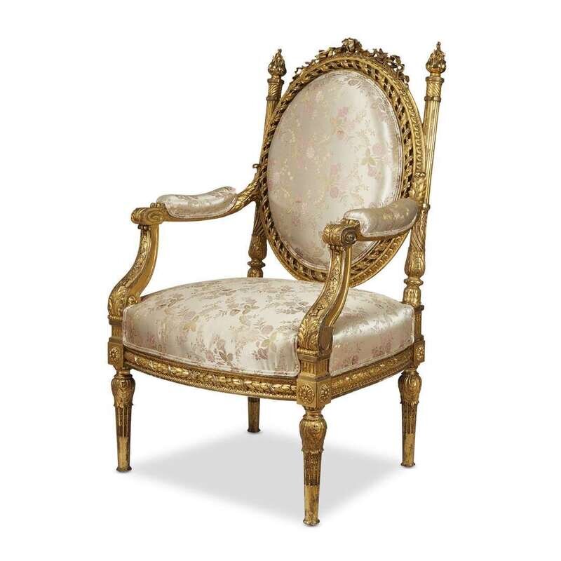 An impressive Louis XVI style carved giltwood fauteuil à la reine with silk brocade upholstery late 19th century