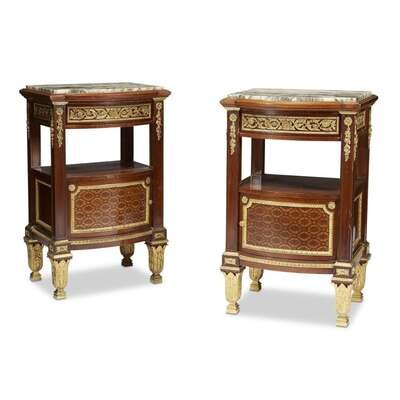 A pair of Louis XVI style ormolu-mounted fruitwood parquetry mahogany tables en chiffonière the mounts by Jean Rabiant, late 19th/early 20th century