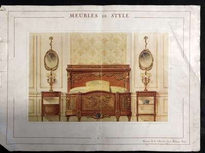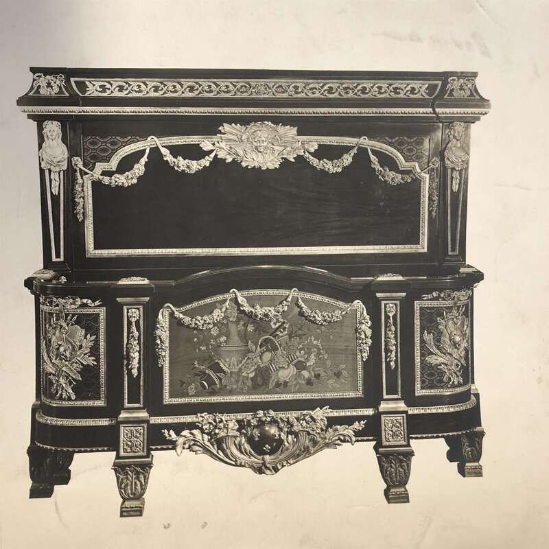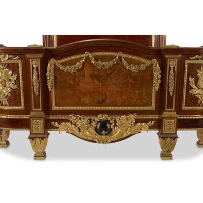 After the design by Jean-Henri Riesener (German/French, 1734-1806) for the commode for La Chambre de Louis XVI à Versailles, the headboard with cavetto cornice above ormolu banded panel surmounted by a sun-in-splendour, flanked by beaded pilasters headed by classical busts; the rails with leaftip-cast ormolu banding, the demilune footboard with central floral marquetry panel hung with floral garlands flanked by curved parquetry panels mounted with appliques representing allegories of music hung from ribbons; the base centered by ormolu cornucopia surrounding a cobalt blue enabled globe mounted with fleurs-de-lys.