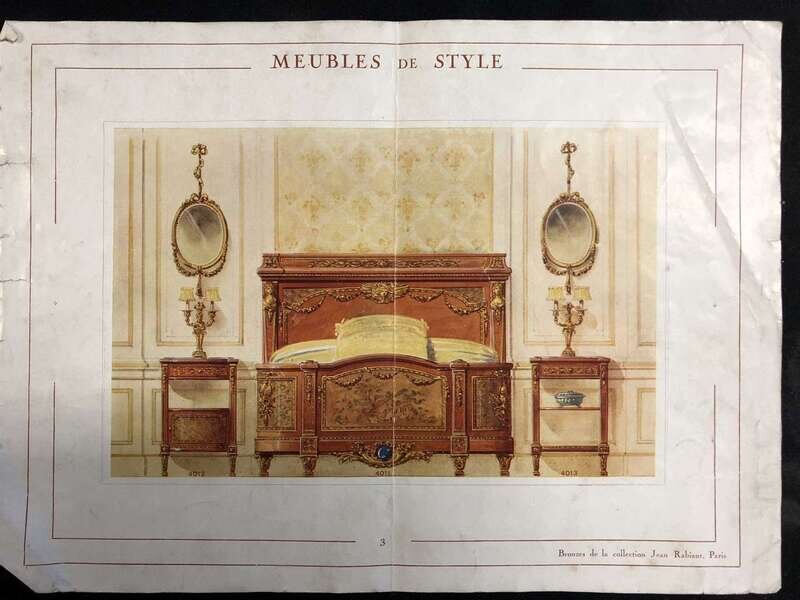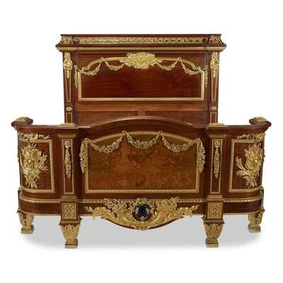 A fine and impressive Louis XVI style ormolu and enameled bronze mounted fruitwood marquetry and parquetry mahogany bedframe the mounts by Jean Rabiant, late 19th/early 20th century