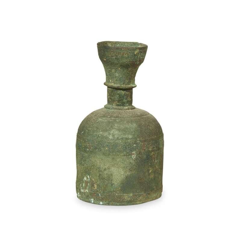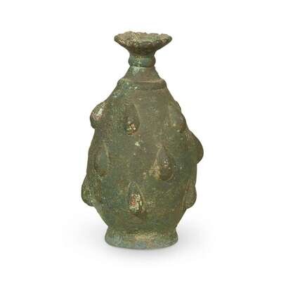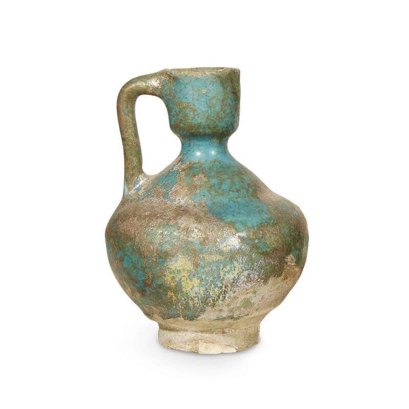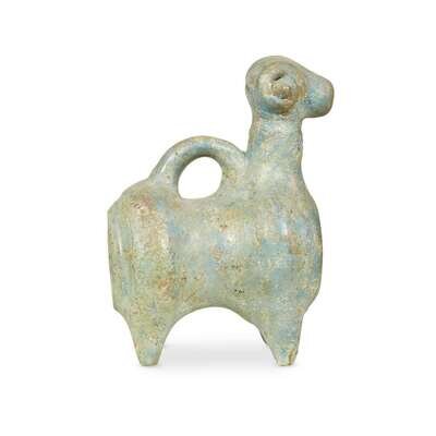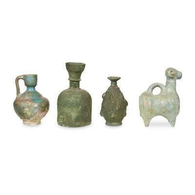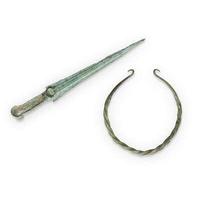 Comprising a bronze unguentarium, a bronze bottle vase, a bronze dagger, a bronze torc, a ram-form ceramic pitcher with turquoise glaze, and a small ceramic pitcher with turquoise glaze. (6).