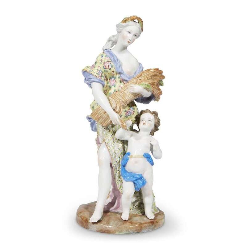 Depicting Ceres with wheat chaff diadem and bouquet, with a putto at her feet; with blue underglaze sword and dot mark to underside.