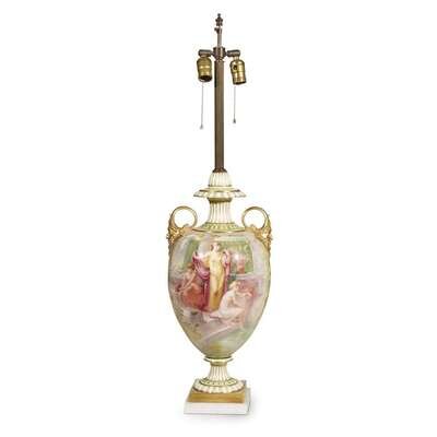 Painted to recto with a scene of three beauties, and to verso with a scene of two bathers, signed "G. WHITE;" now drilled as a lamp and mounted on marble base.