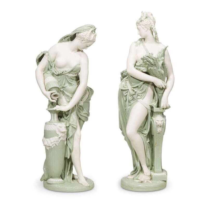 A large pair of Minton celadon-glazed bisque figures representing Spring and Autumn 1873