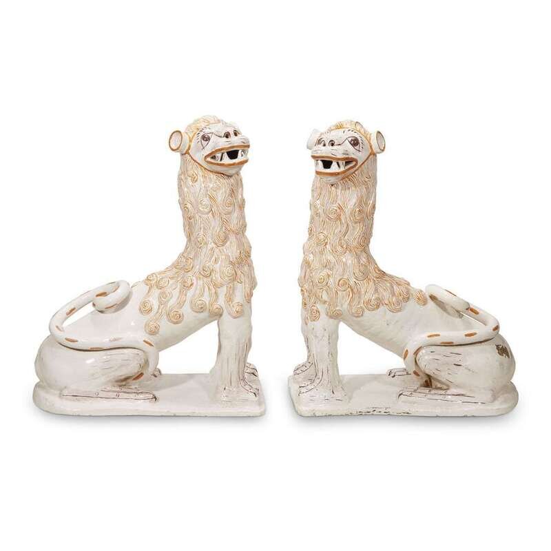 A large pair of Portuguese faience models of foo lions circa 1800