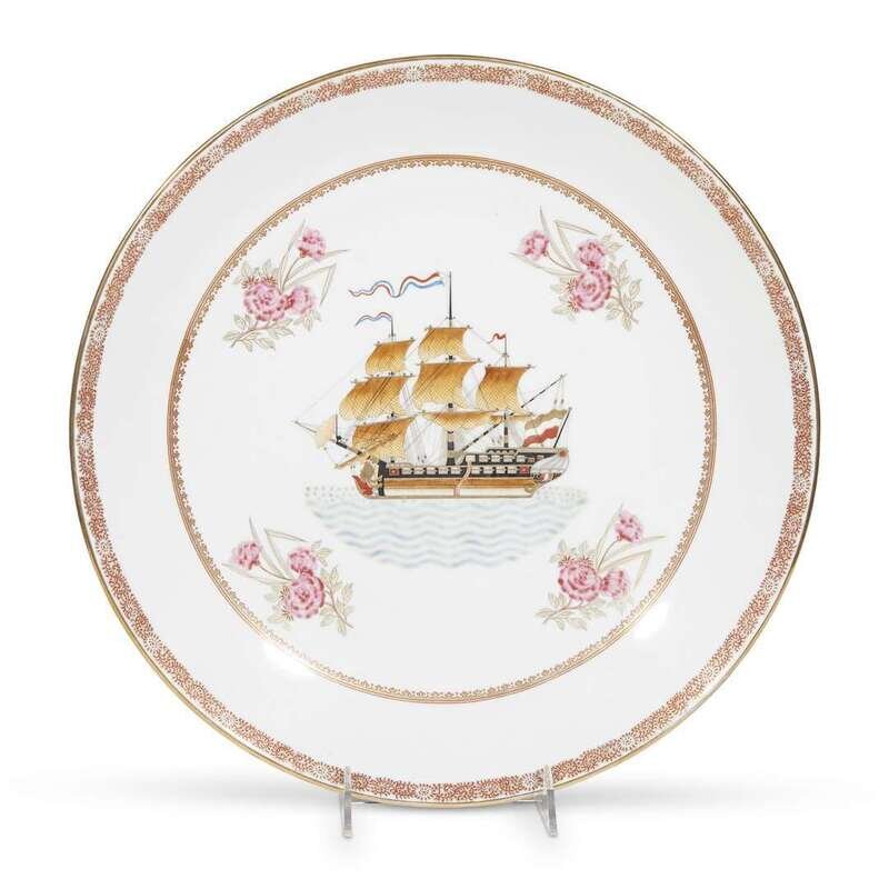 Depicting the East Indiaman Vryburg flying the Dutch flag, surrounded by pink peonies and with parcel-gilt iron red stylized floral border; the verso further decorated with pink peony sprays.