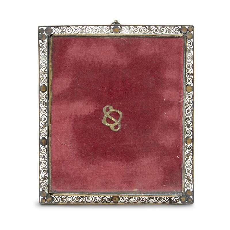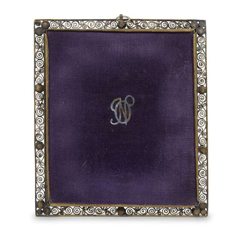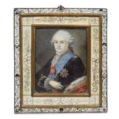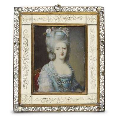 The miniatures likely French 19th century, the frames with filigree borders set with pearls, surrounding hand-etched bone insets with floral motifs, centering miniature portraits each bearing the signature "A. Roslin," the first depicting H.I.&R.H. Archduchess Maria Amalia of Austria, Duchess of Parma (1746-1804) after the portrait by Alexander Roslin (Swedish, 1718-1793), the second depicting H.M. King Stanislaw II Augustus of Poland, Grand Duke of Lithuania (1732-1798) after the portrait by Giovanni Battista Lampi (Austrian-Italian, 1751-1830). (2).