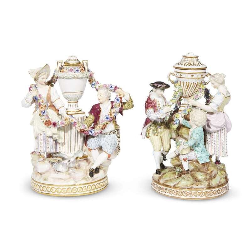 Two Meissen porcelain figural covered urns one possibly 18th century, the other 1815-1860