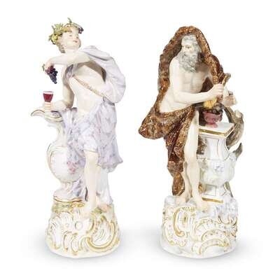 After the Four Seasons modeled by Friedrich Elias Meyer (German, 1723-1785); each with blue underglaze crossed swords mark and various incised and impressed marks to underside. (2).