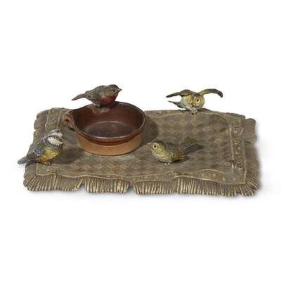Cold painted bronze, depicting four birds on a carpet, marked to underside "GESCHUTZT/OESTERREICH. F. BERGM./DEUTSCHLAND. 459."