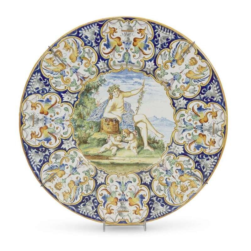 The well painted with Bacchus and two putti, the wide rim with cobalt blue ground decorated with fruit-filled urns and masques en grisaille with white cartouche-form reserves decorated with similar motifs between weyverns.