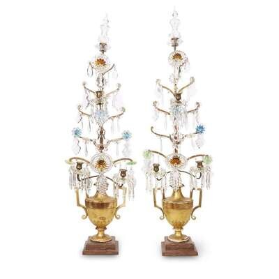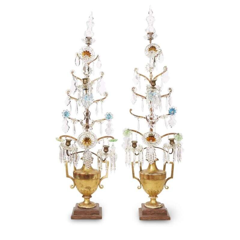 Each with giltwood urn base issuing an impressive five-tiered central standard suspended with crystal drops terminating in glass vasiform finial. (2).