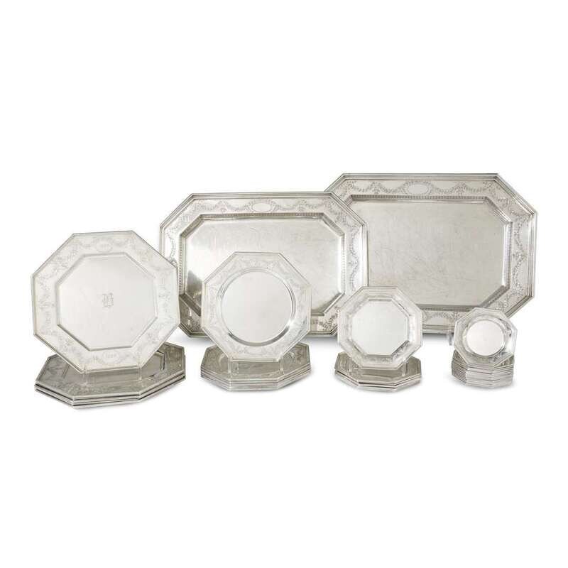 Retailed by Bailey, Banks & Biddle, octagonal form, borders with Federal style hand engraved bright cut decoration; comprising twelve pickle dishes, six bread plates, six dessert plates monogrammed "B," six service plates monogrammed "B" and dated "1903" and "1928" and engraved to verso with anniversary inscription "November 25, 1928," and two serving platters. (32).