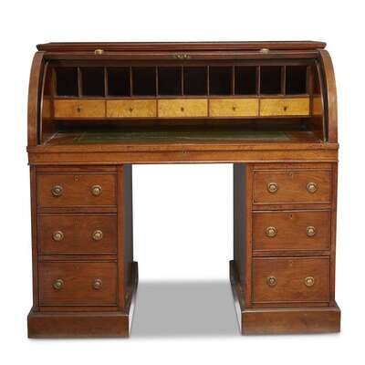 The cylindrical top with brass pulls opening to an interior with ten pigeonholes over five satinwood-veneered drawers above green gilt-tooled leather writing surface, the lock by Hobbs & Co., the whole raised on two pedestals each with three drawers.