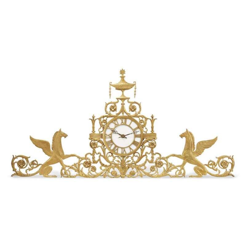 Of pedimental form with central glass dial surmounted by urn-form finial housed within a rinceau and strapwork frame flanked by winged gryphons; now electrified.