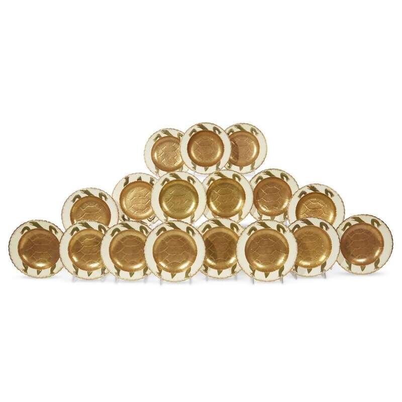 The well gilt and moulded in the form of a turtle shell, the rim with cream ground and parcel-gilt green head, legs, and tail; all stamped or impressed to verso with maker's mark, impressed "ENGLAND," with painted model number 1533, and some with additional impressed letter marks. (17).