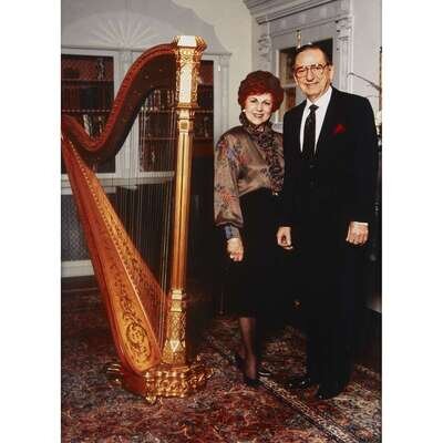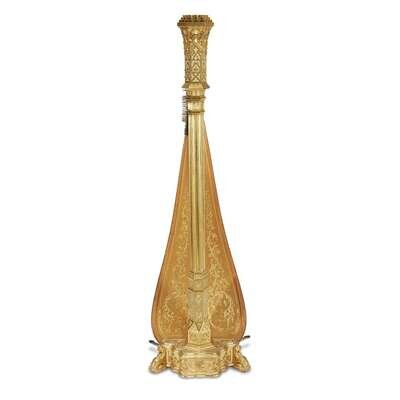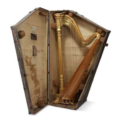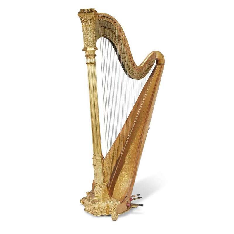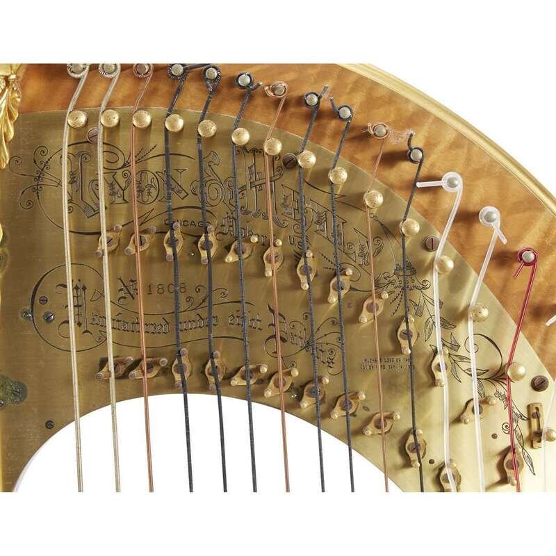 Serial No. 1808, maple with spruce soundboard hand-painted and parcel-gilt with a trellis of flowers, the fluted column with carved giltwood capital and base in the Gothic style, with 46 strings and seven pedals; sold together with original Lyon & Healy custom fitted case, the interior fitted with card hand inscribed with serial number and style "Special No. 3." (2).