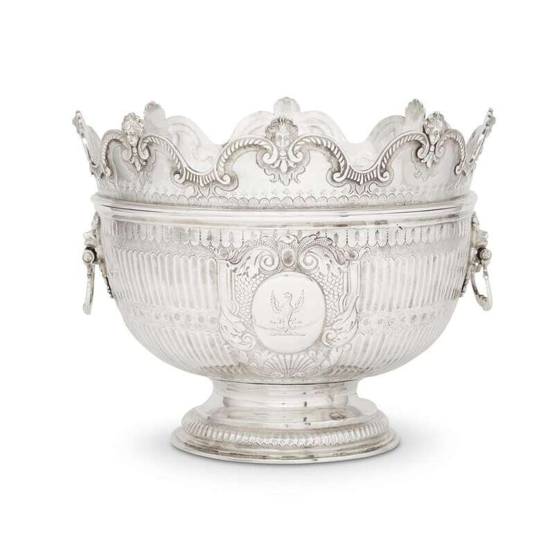 The deep bowl with two fluted bands and edged with a band of inverted bosses against matte ground, both sides carefully chased with two cartouches of foliate strapwork and shell enclosing an imbricated ground with reserves engraved with crests; the ring handles mounted on lion masques and raised on partially fluted foot, the detachable collar with scalloped rim applied with cherub heads flanked by rope-twist scrolls; underside of foot engraved with presentation inscription, "Presented to H. J. Hines by the Directors of the Royal Exchange Assurance. 1919;" bowl marked near rim, collar marked on rim.