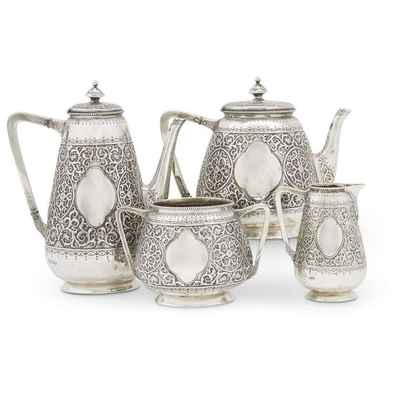 Comprising a teapot, coffeepot, open sugar, and creamer, each overall repousseed with arabesques and Orientalist motifs. (4).