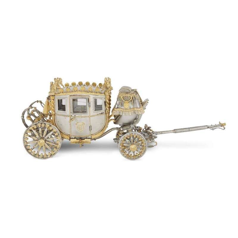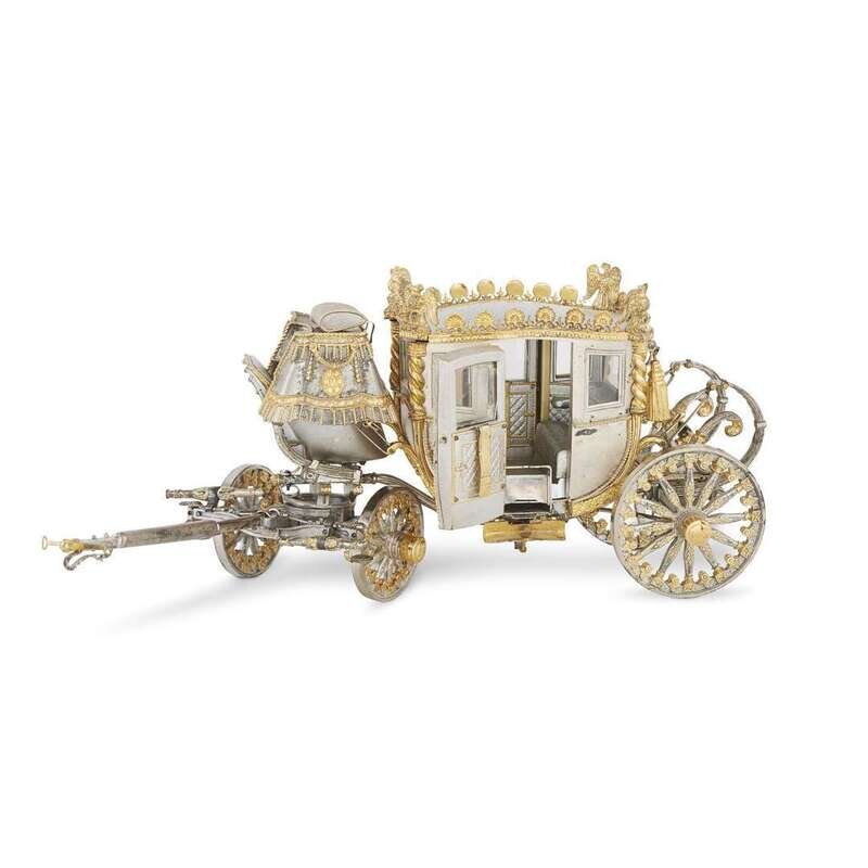 An American parcel-gilt sterling silver model of a coronation coach attributed to Silver Creations, circa 1973