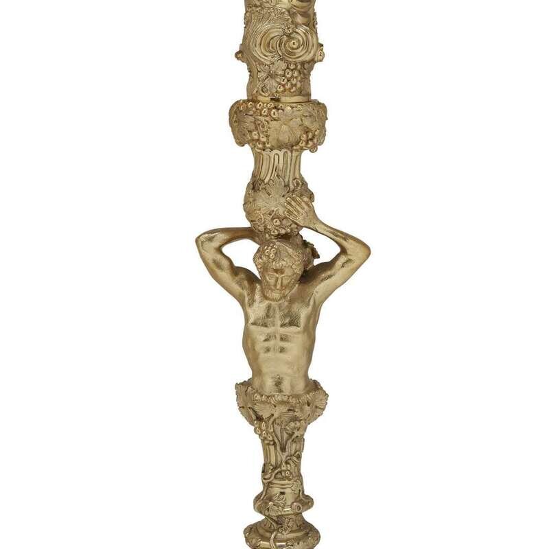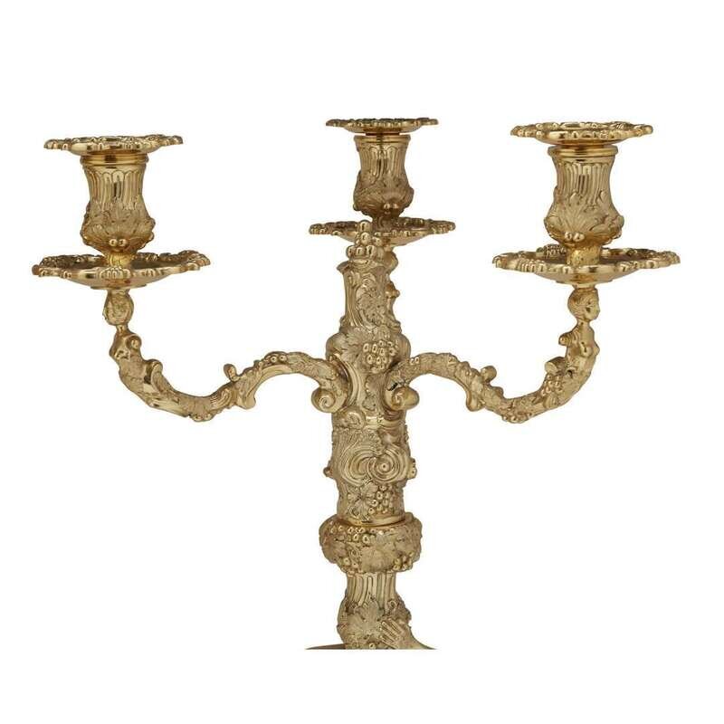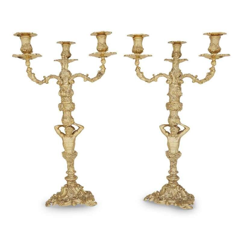 After the model by Paul de Lamerie (English, 1688-1751), each in the form of a Bacchic central standard above a rocaille-scrolling base with grapes, grapevines and leaves, each supporting three similarly decorated caryatid candlearms. (2).