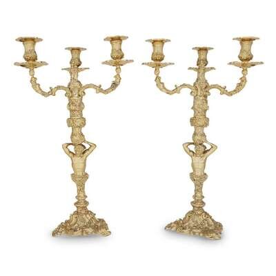 A fine pair of Elizabeth II sterling silver-gilt figural three-light candelabra Garrard & Co., London, 1975