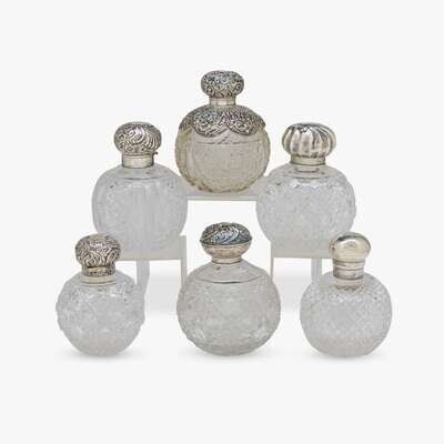 The cut-glass bodies of spherical form with silver-mounted tops, various makers include Horton & Allday, John Grinsell & Sons, George Bedingham, and Lines, Bunn & Mason; various sizes. (6).