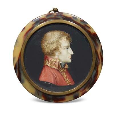 A portrait miniature of an officer with piqué-work and mother-of-pearl inlaid tortoiseshell frame probably French, early 19th century
