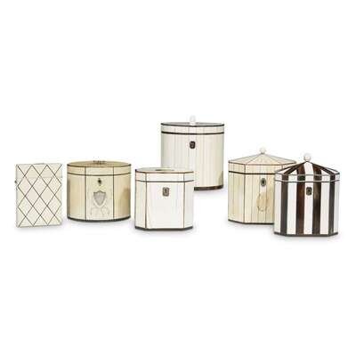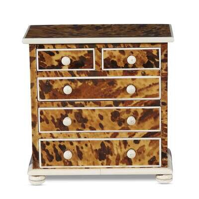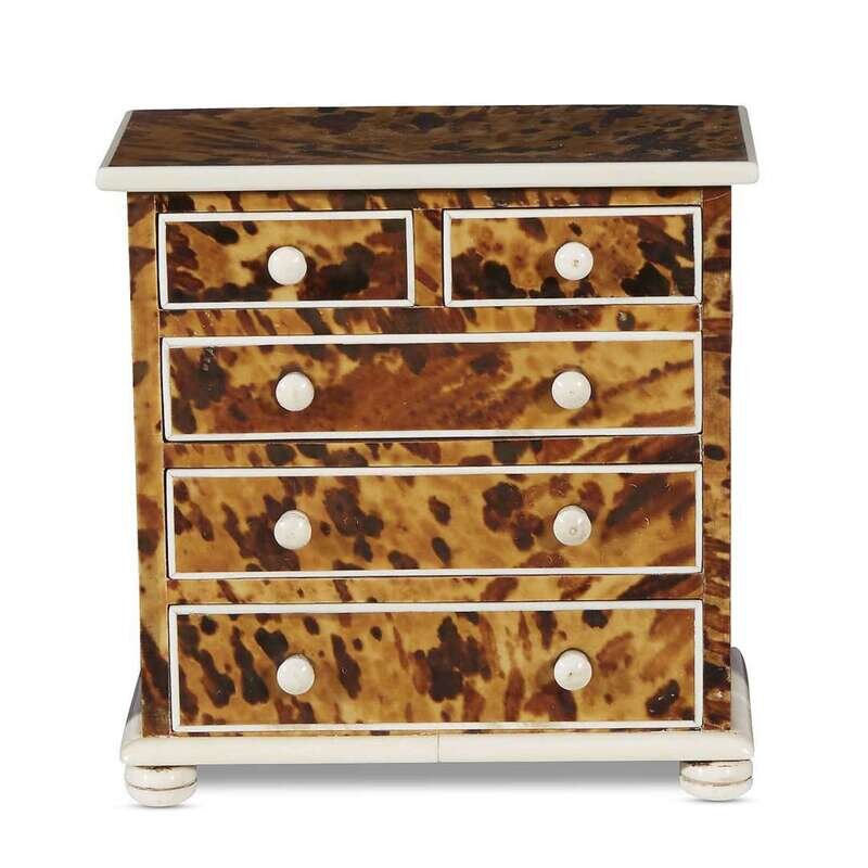 Comprising five George III bone and tortoiseshell inlaid ivory tea caddies, a George III miniature chest of drawers, and a Regency ivory veneered card case. (7).