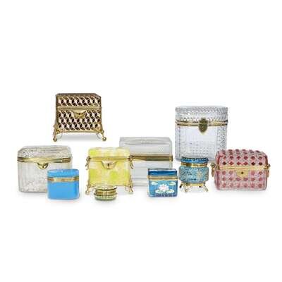 Comprising two large cut-glass boxes, a painted glass box, a parcel-gilt yellow opaline glass box, a red-flashed cut-glass box, a harlequin-pattern enameled glass box, a small round enameled blue glass box, an enameled blue glass box, and two opaline glass boxes. (10).