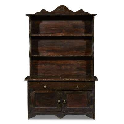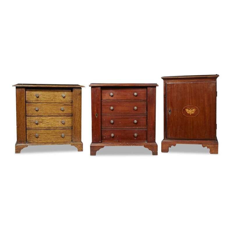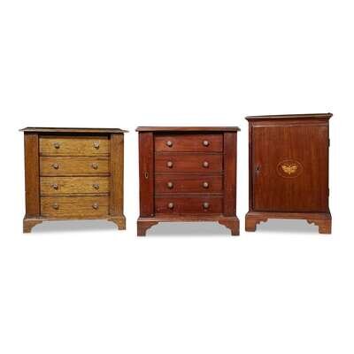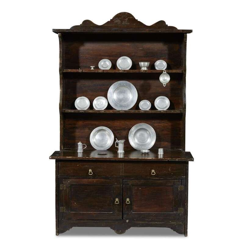Comprising a mahogany Wellington chest, an oak Wellington chest, a mahogany spice cabinet, and an oak dresser with a collection of 17th-19th century English and Continental pewter wares. (4).