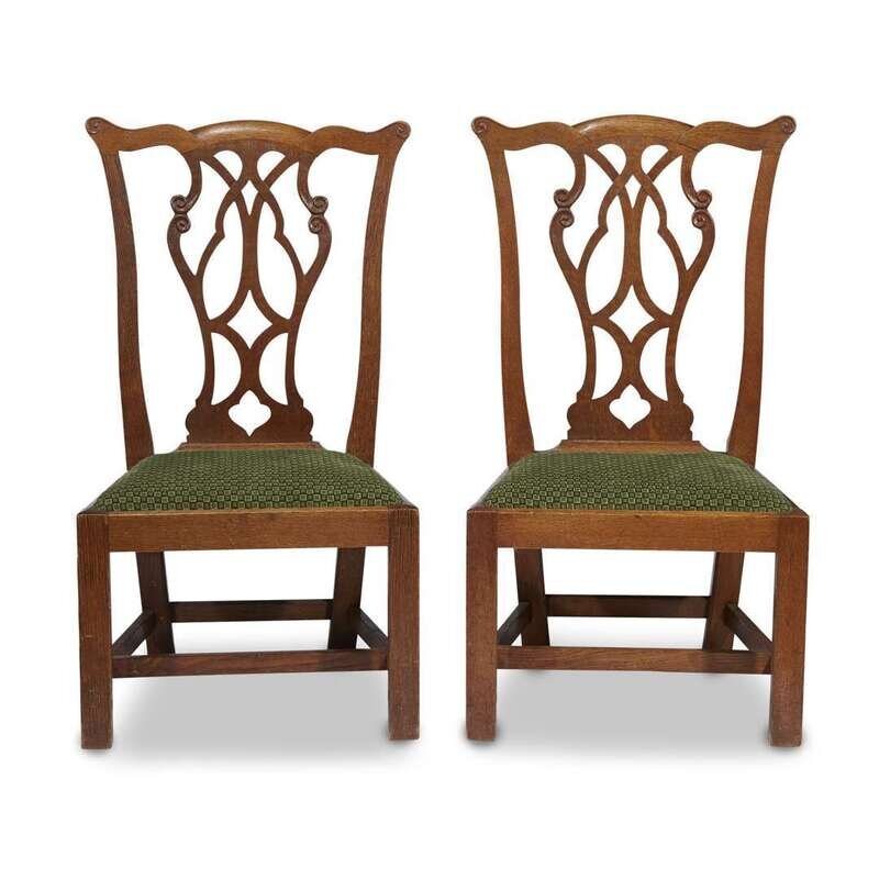 With Gothic style splats, upholstered in green geometric voided velour. (2).