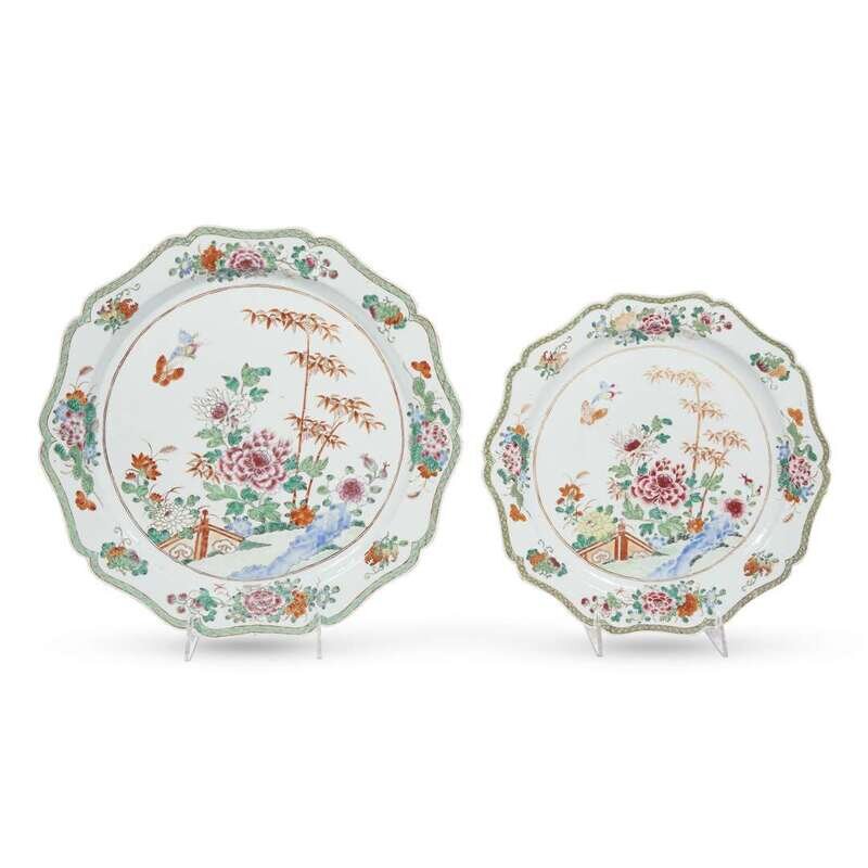 A pair of Chinese export porcelain famille rose chargers circa 1740