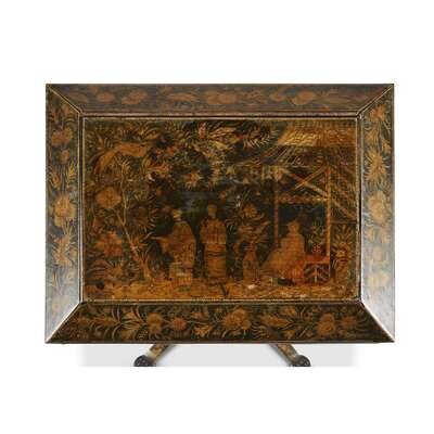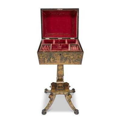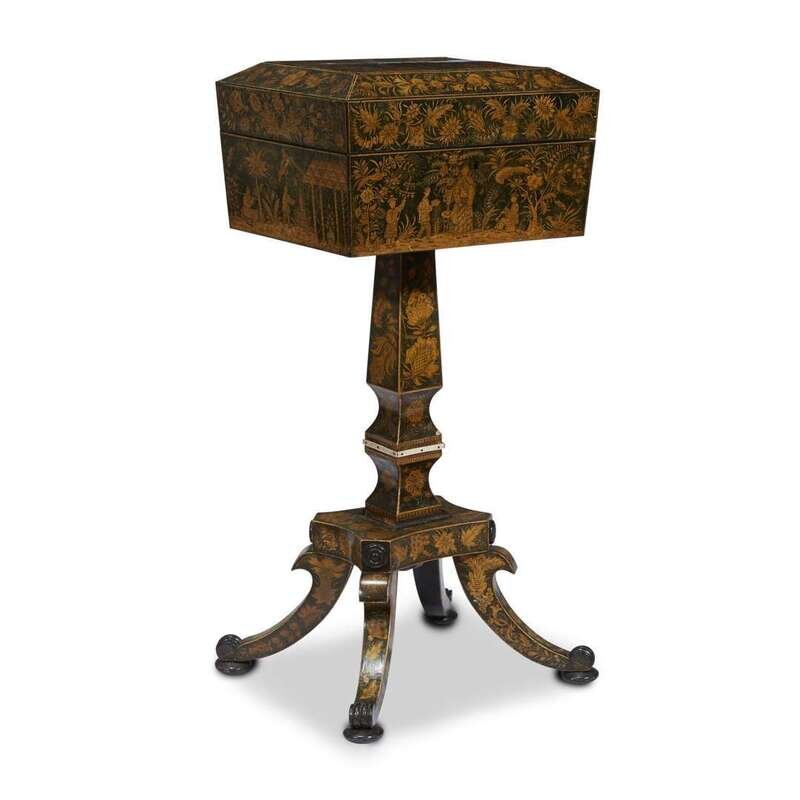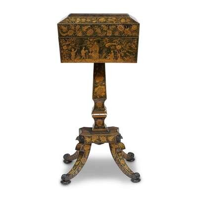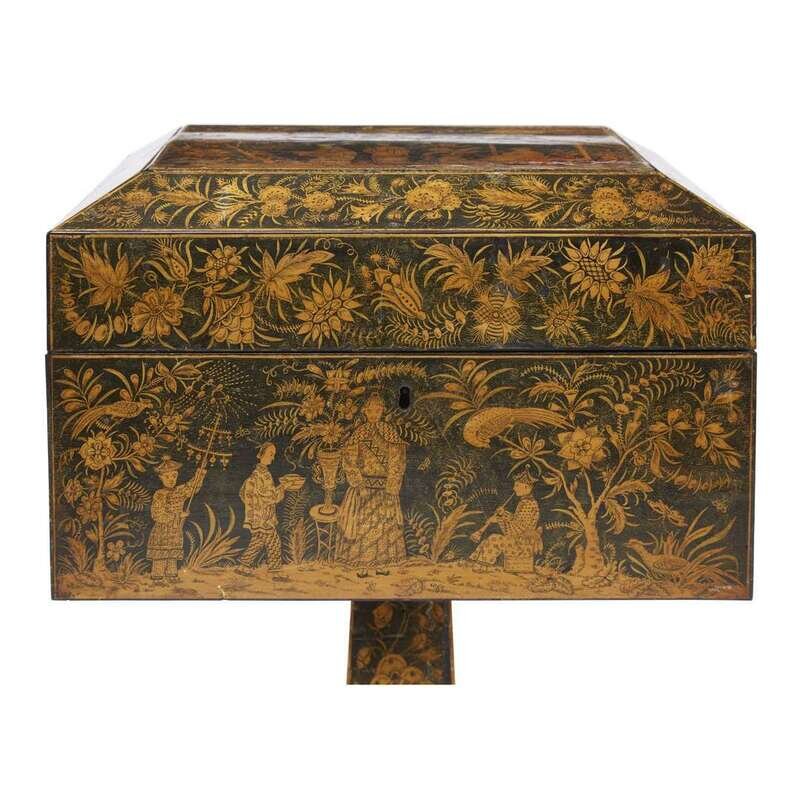 Of casket form, the hinged lid decorated with figures and birds in a Chinese setting opening to reveal the original fitted interior lined in crimson velvet, including two removable teaspoon holders further penwork decorated; the sides and pedestal similarly decorated, raised on four outscrolled legs terminating in paw feet.