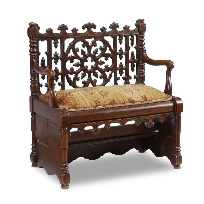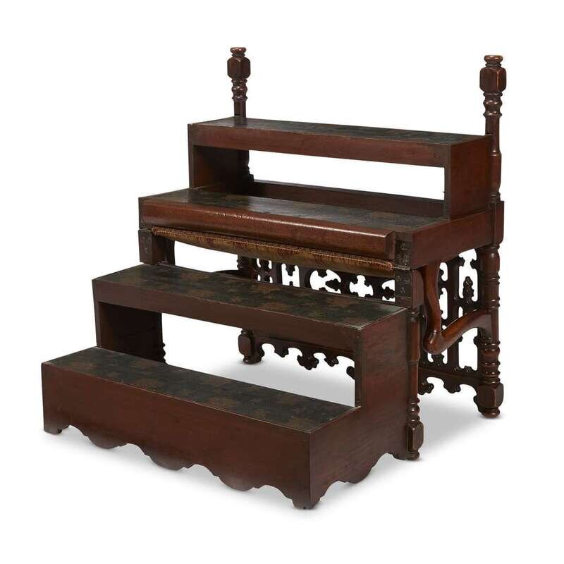 In the form of a miniature Gothic bench, mechanically transforming into a set of library steps.