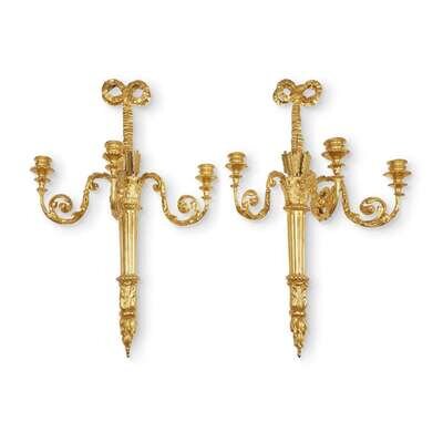 Each in the form of a ribbon-tied beaded and fluted quiver of arrows with acanthus terminal, issuing three scrolling foliate arms; sold with etched glass bobèches. (2).