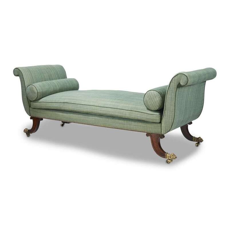 With scrolled ends, raised on carved mahogany outswept feet terminating in gilt-bronze lion's paw sabots on castors; upholstered in eau de nil raw silk and sold with two bolsters.