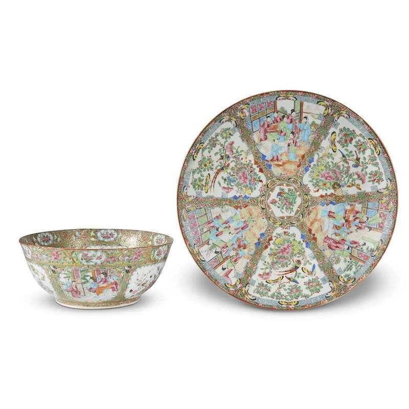 A Chinese export porcelain rose medallion punch bowl and charger 19th century