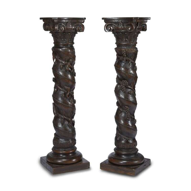 A pair of Continental carved oak Solomonic column pedestals 18th century
